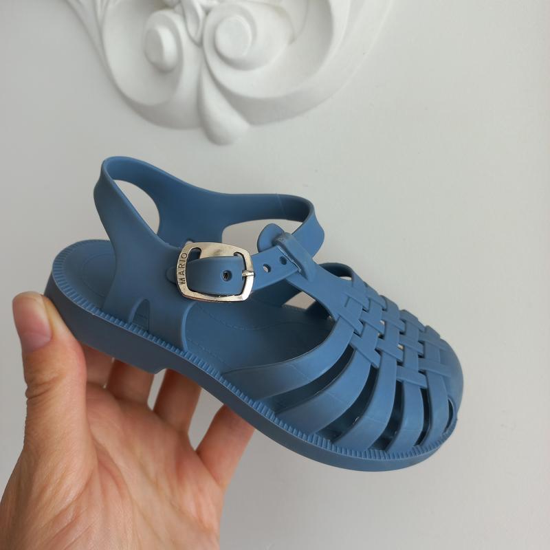 Лёгкие силиконовые босоножки- мыльницы. Стелька- 14см. Цвет красивый серо-голубой. Застёжка на кнопку с имитацией пряжки. Есть нюанс! На одном босоножке утеряна пряжка- кнопка! Поэтому такая низкая цена. Можно прицепить новую (продаётся в магазинах фурнитуры). Но мы носили и так (нормально держались, не растёгивались)