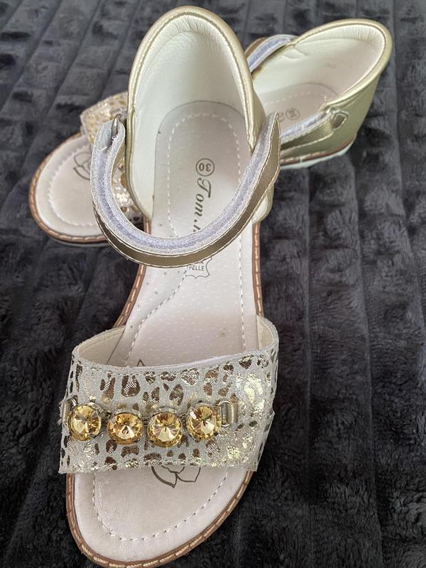 Босоножки для девочки в очень красивом состоянии. Есть 1 маленький минус - на одном из босоножек выпал 1 камушок. Все видно на фото. Размер 30. Одетые были 2 раза.