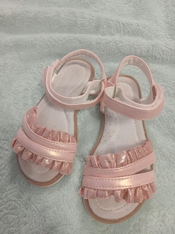 Босоножки для девочки цвет перламутровая пудра. Кожаная ортопедическая стелька. Збоку на ліпучці. Полиуретановая прослейка, защищает от взбивания носочка. Размер 27-16 см.