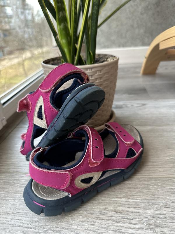 Сандалии для девочки, состояние хорошее, выстиранное, но стелька кожаная потемнила. Очень удобные, регулируются на любую ножку. По стельке от края до края 19,5 см, идеально подойдут на ножку 18-18,5см.