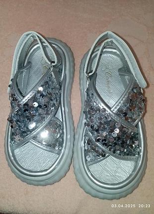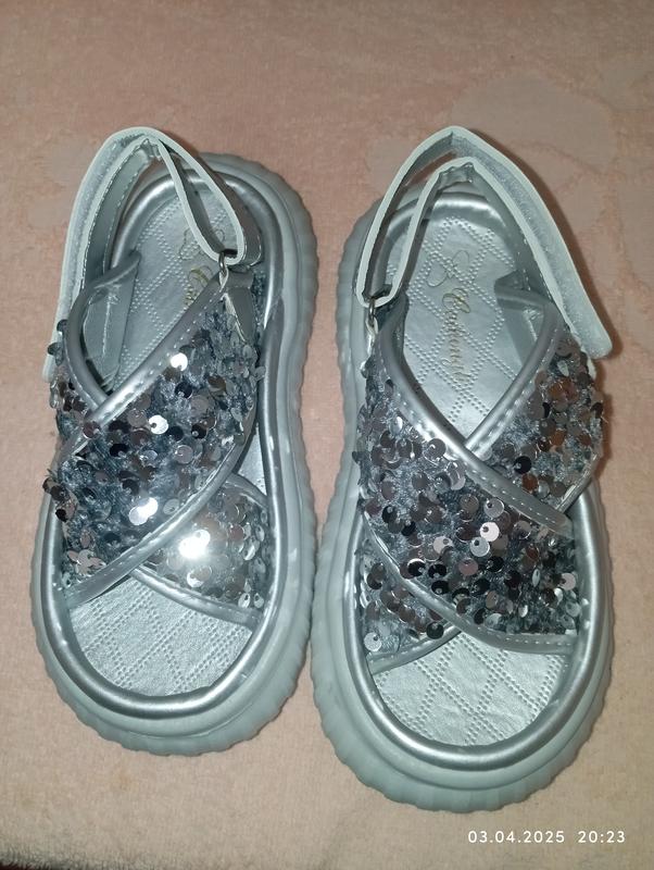 красивые новые босоножки для девочки блестящие и удобные. 16.5 см длина от по внутреннему краю. написано 29 размер, по факту 25-26.сзади регулируется по длине липучкой