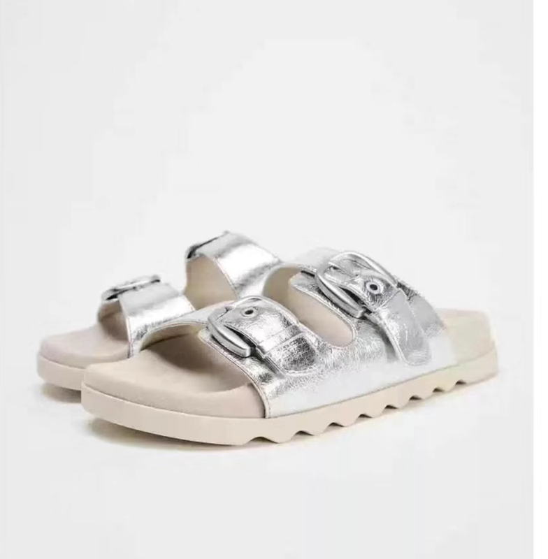 Шлепки (сандали) Zara серебряного цвета. Размер 38- 38,5. Стелька - 24,5. Очень удобные. З логотипами