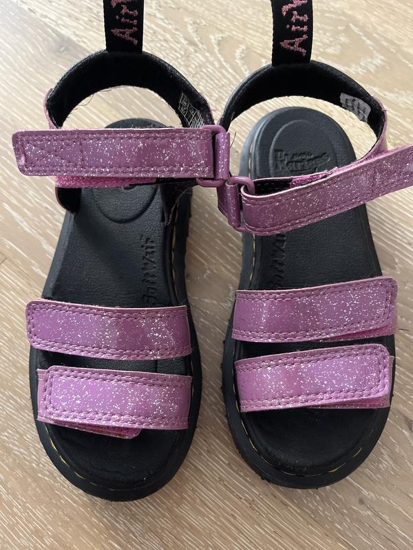 Красиві босоніжки світового бренду Dr. Martens. Натуральна шкіра преміум якості з глянцевим блискучим покриттям. Регульовані ремінці на липучці забезпечують зручну посадку. Устілка з піни з ефектом памʼяті SoftWair.