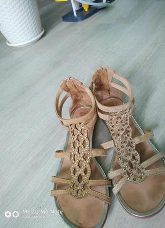 Классные, удобные, кожанные(нубук), нигде не отклеенны, качественно сделанны, ремешки мягкие, камни все на месте, с внутренней стороны стопы на ремешках есть резинка для комфортной хотьбы, набойки не счесанны, застегиваються сзади на замочке(все рабочее) ,по стельке-22.5см.