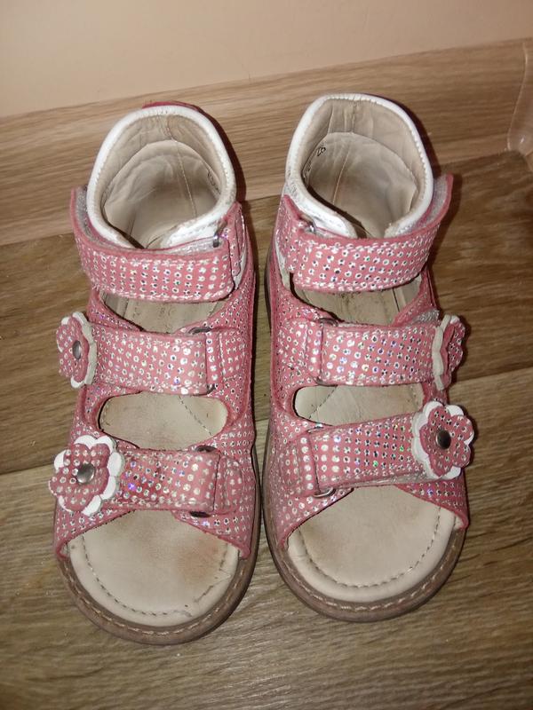 Повністю шкіряні, ортопедичні сандалі для дівчинки. З квіточками на застібках. З блискучими ефектними вкрапленнями. Розмір 26.