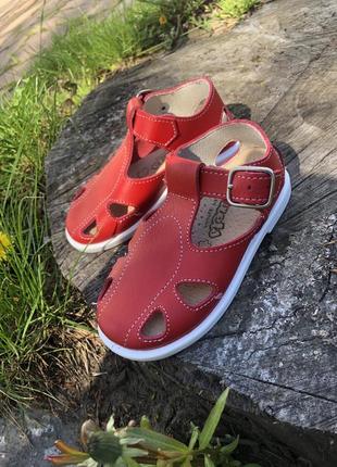 Босоніжки дитячі. Червоного кольору. Виробництво Іспанії . Повністю шкіряні, як верх так і середина. Легкі, м'ягкі та надзвичайно комфортні. 22 розмір -13 см 23 розмір -14 см 26 розмір -16 см
