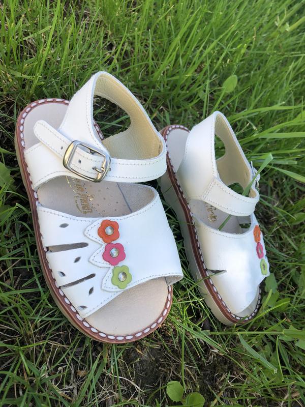 Босоніжки для дівчинки. Виробництво Іспанії . Повністю шкіряні , як верх так середина. З супінатором. Босоніжки біленького кольору, оздоблені яскравими квіточками . Ніжні, доброї якості.В наявності є 20,23,24 розміра.