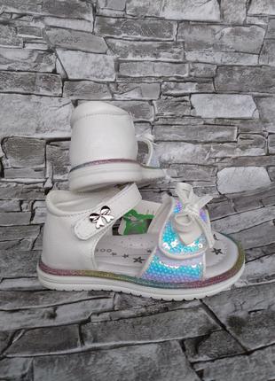 Босоножки для маленьких принцесс Kimboo. Очень нежные и стильные. Верх выполнен из искусственной кожи. Подошва-вспененая резина. Стелька кожаная с супинатором. Жёсткий задник и 2 липучки для лучшей фиксации ножки. Длинна стельки (замеры сделаны от пятки до конца стельки,без ободка) р.22-14 см, р.23-14,5 см,