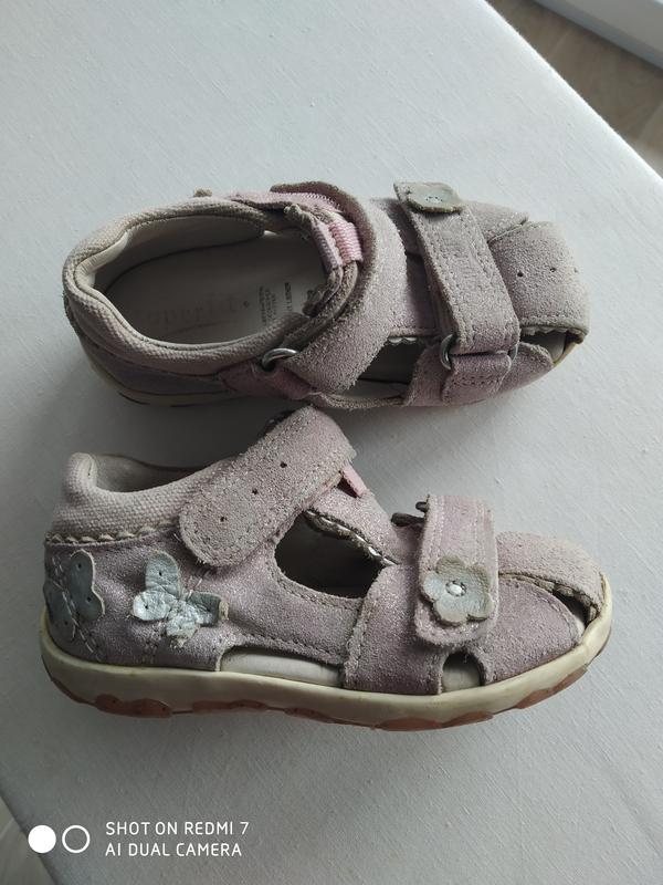 Босоніжки для дівчаток. Розмір 22(стелька 14 см). Верх і середина- натур. нубук і натур. шкіра. Фірма Super fit. Стан хороший. Застібки на ліпучках.