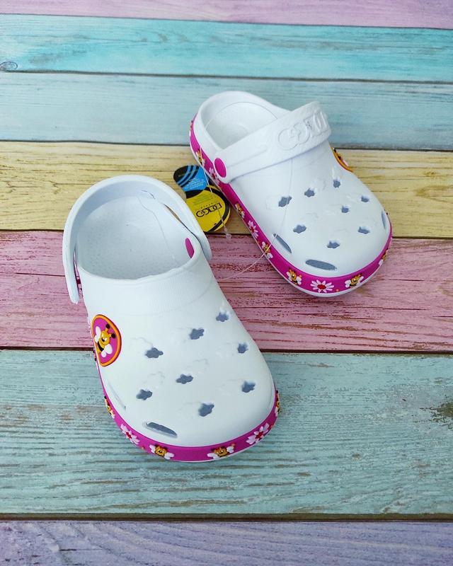 Білі крокси з рожевими вставками та бджілкою💕🐝💕 ▫️Матеріал - піна ▫️Виробництво - Україна ▫️Зручні та дуже легенькі ▫️Чудово носяться та легко миються Заміри: 24/25 - 15,5 26 - 16,5 27 - 17,5 28 - 18,0 29 - 18,5 30 - 19,5 ❎ 31 - 20,0 ❎ 32 - 20,5 Для замовлення та підбору розміру в ↗️Дірект💕 ————————————— ✅Відправка: Нова Пошта, Укрпошта, Justin ✅Оплата 💯% на карту або наложений платіж по мін.передплаті 100 грн