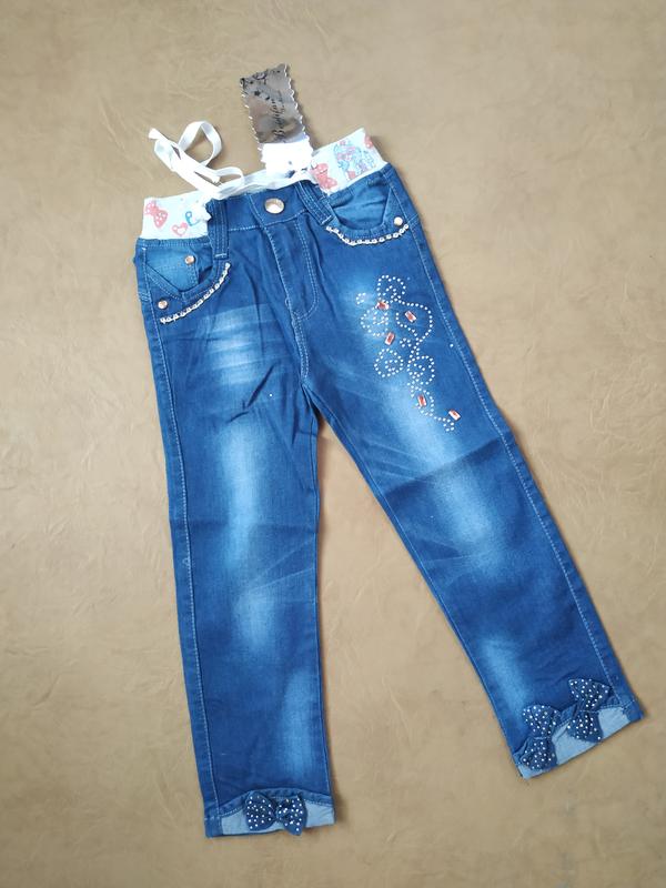 Производство Китай, тонкий джинс В поясе шнурок-утяжка, стразики Стрейч, тянутся Замеры: р.7 (98см): длина 53см, шаг 37см, пояс ПО 23см (резинка+шнурок), бедра ПО 28см р.9 (104см): длина 56см, шаг 39см, пояс ПО 23см (резинка+шнурок), бедра ПО 30см р.11(110см): длина 59см, шаг 41см, пояс ПО 24см (резинка+шнурок), бедра ПО 32см р.13: НЕТ р.15 (116см): длина 63см, шаг 44см, пояс ПО 25см (резинка+шнурок), бедра ПО 33см