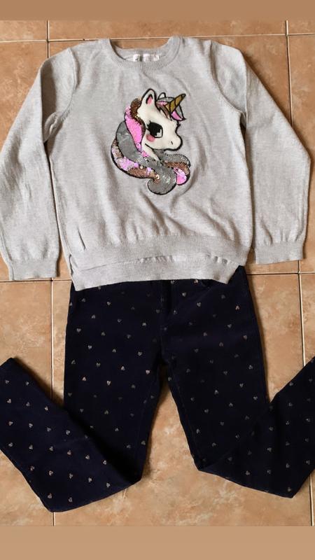Очень красивая кофта на девочку. Единорог украшен пайетками перевертышами. Ткань мелкая вязка. Состав 100% хлопок размер 4-6г 110/116 рост Трендовые треггинсы из хлопкового вельвета синего цвета, усыпанного золотистыми звёздами. Передние карманы- "обманка". Задние карманы- реальные. Размер 5-6г 116 р