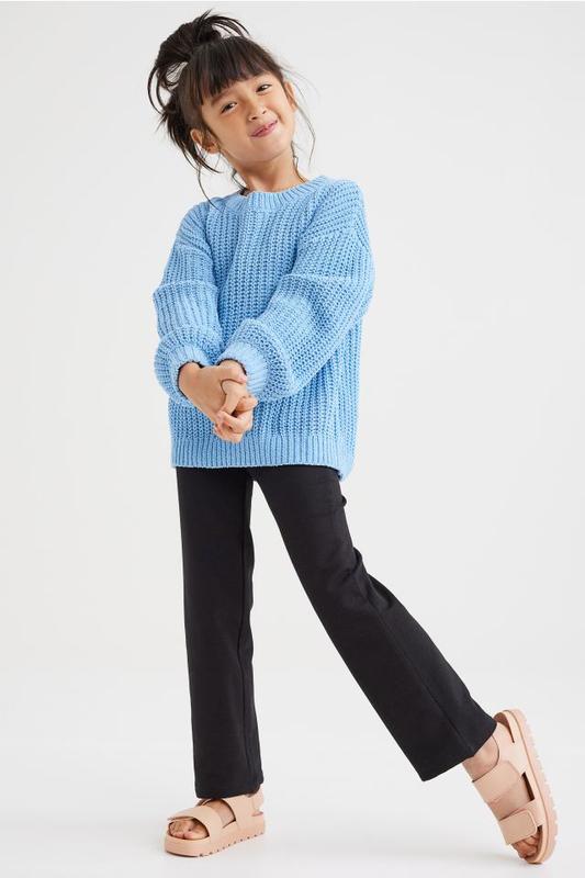Утеплені легінси з бавовняного трикотажу з прихованою гумкою на талії. Облягаючі до колін з розкльошеними подолами.