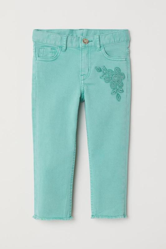 Штани довжиною три чверті з еластичного твілу. Вишитий малюнок зверху. Кишені спереду і ззаду. Необроблений край з бахромою знизу на штанинах. Регульована гумка на талії, а також хибний гульфик. СКЛАД Бавовна 98%; Еластан 2% Розміри: 98 {2-3 року} 104 {3-4 року} 110 {4-5 року}