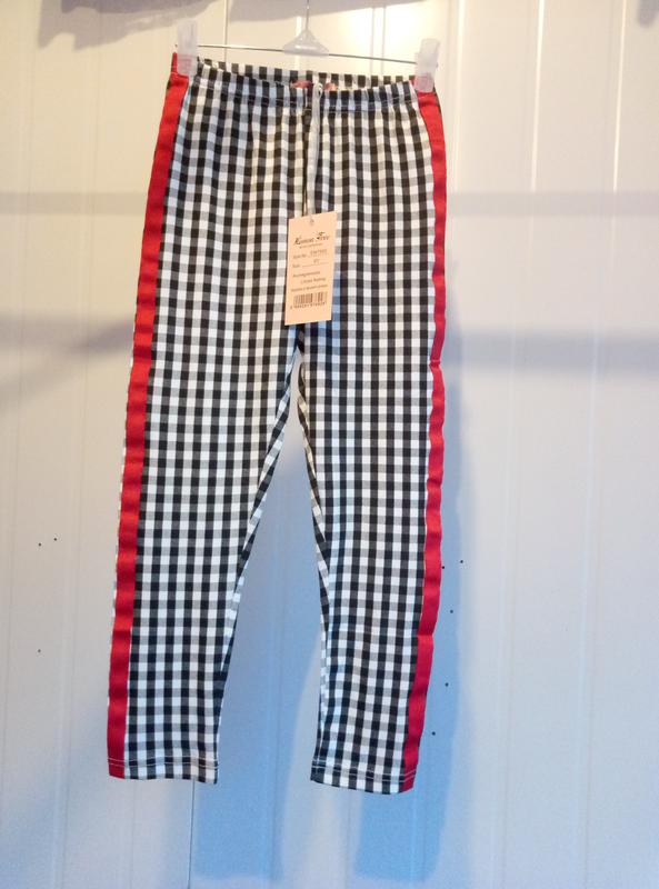Дужe гарні лосіни, клітинка, по боках лампаси чeрвоні або чорні, якість супeр, добрe тягнуться. Розміри 6-12 років.