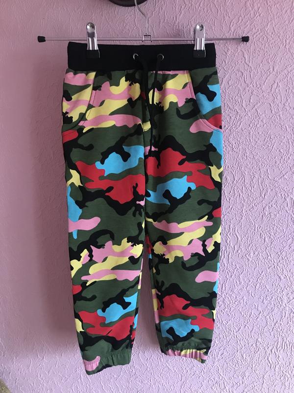 Камуфляжные, яркие, трикотажные брюки для девочки, отличного качества, производства Украины, торговая марка Овен, идеально подходит для осени, холодной погоды, есть множество карманов, по талии на резинке и стягиваются шнурком, новые с биркой, цена снижена, есть размер на рост 110 и 98.
