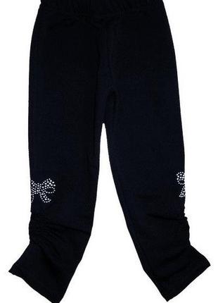 Красивые лосины с присбором по боковому шву на тоненькой резинке, украшены стразами. Пояс на мягкой широкой резинке. Цвет: Тёмно-синий; Полотно: Футер без начеса (2-х ниточный); Состав: 95% хлопок, 5% эластан; Оформление: Стразы; В наличии рост 98.