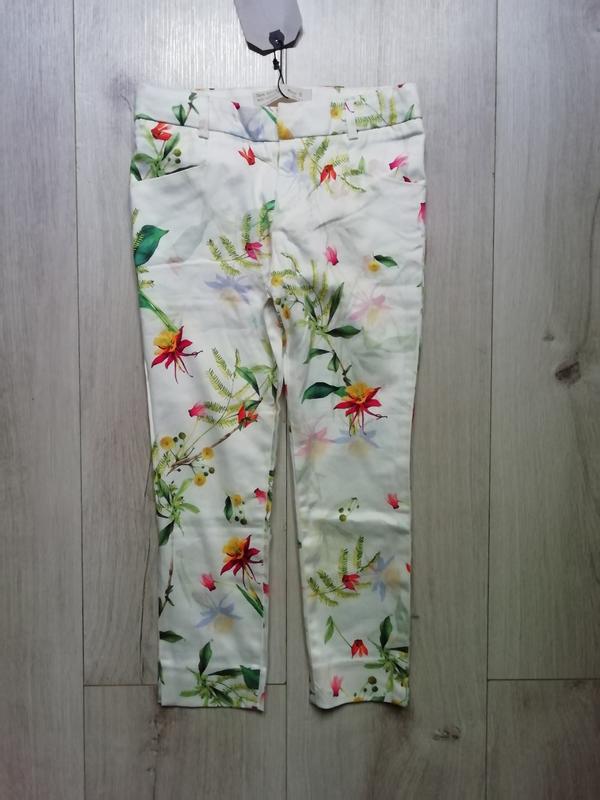 Злегка укорочені і з розрізами. Дуже класний яскравий принт. 97% коттон, 3% еластан. Тканина легка, потягнеться дуже мало. Довжина 57 см(вкорочені), крок 40 см, посадка 17 см і ззаду 20 см, пояс 27 см. Защіпається на гачок і замок. Колір молочний