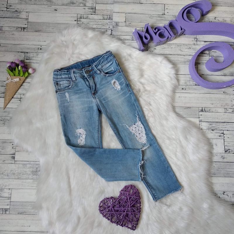 Джинсы Zara на девочку голубые рваные В хорошем состоянии Размер 4,рост 104 см Замеры: Длина 52 см Шаг 35 см посадка 20 см ПОТ 24 см,есть потайная резинка ПОБ 28 см цвет голубой состав 95% коттон,3% полиэстер,2% эластан