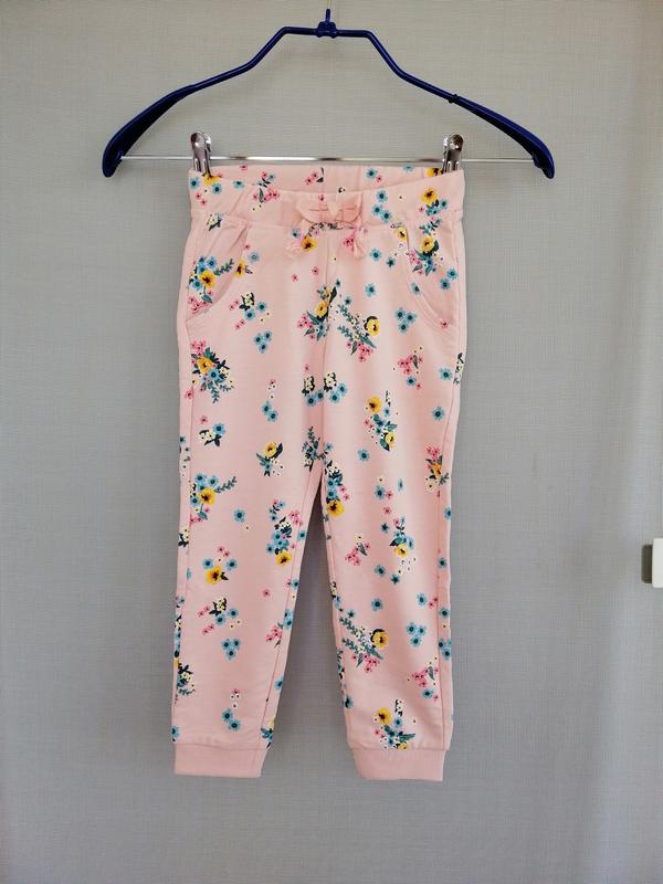 Красивые штанишки из мягкого гладкого трикотажа с небольшими петельками внутри. Нежный цветочный принт. По бокам два кармана. В поясе резинка.