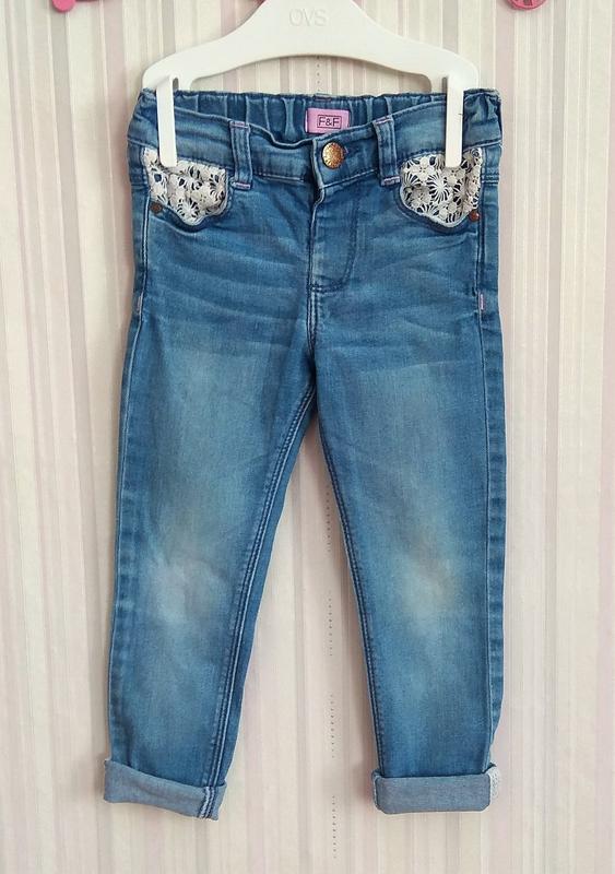 Голубые джинсы с кружевом F&F в размере 2-3 года. Состояние нормальное. Немного тянутся. Кружева на карманах и на отворотах. Есть утяжка, узкие. Подвороты можно отвернуть. 98% хлопок, 2% эластан. Замеры: длина 56, шаг 39, пояс 24, бедра 26. При покупке трех товаров – укрпочта в подарок!