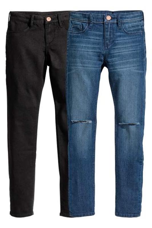 H&M Джинсы очень узкой посадки, с потертостями. Ложные карманы спереди, а также настоящие карманы сзади. Талия на регулируемой резинке (размеры 134-152). Застежка на молнию и пуговицу. ФасонSkinny fit СоставХлопок 82%, Полиэстер 17%, Эластан 1% Цена:519.
