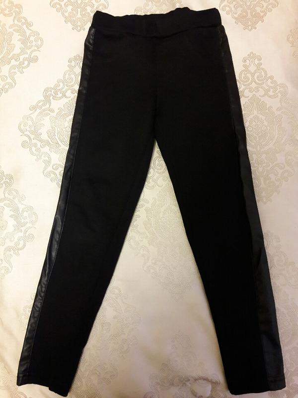Стильные заужены брючки с лампасами из кожзама. Качество супер. Состояние идеальное без дефектов. Размер указан 122см.но большемерят. Подойдут на 134см.Замеры:ПОТ-27см. ШАГ-59см. Длина- 71см.Посадка-20.5/24.5см.