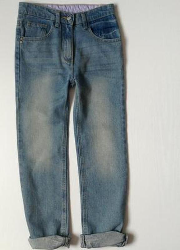 Джинсы Tom Tino 134-140, очень красивая модель-похожи на бойфренды с высокой посадкой. Ткань плотная, не тянется, вся фурнитура метал- заклепки молния и пуговица, с логотипами торговой марки, все потертости и заломы фабричные, пояс полу об 32, посадка перед 23, зад 29, бедра38, длинна по боковому шву 88, шаг 63, ширина штанины верх 20, колено 16.5 см, низ 15см.