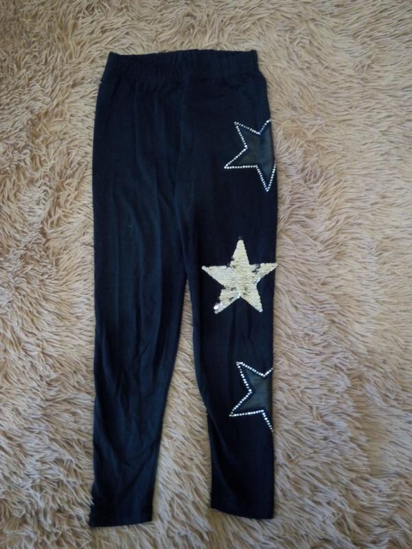 Красивые модные лосины с звездой из паеток. Хлопок. Приятные к телу. Подходят к любой одежде. Очень красивые. Цвет темно-синий.Состояние идеальное. На возраст подойдут от 5-8 лет.