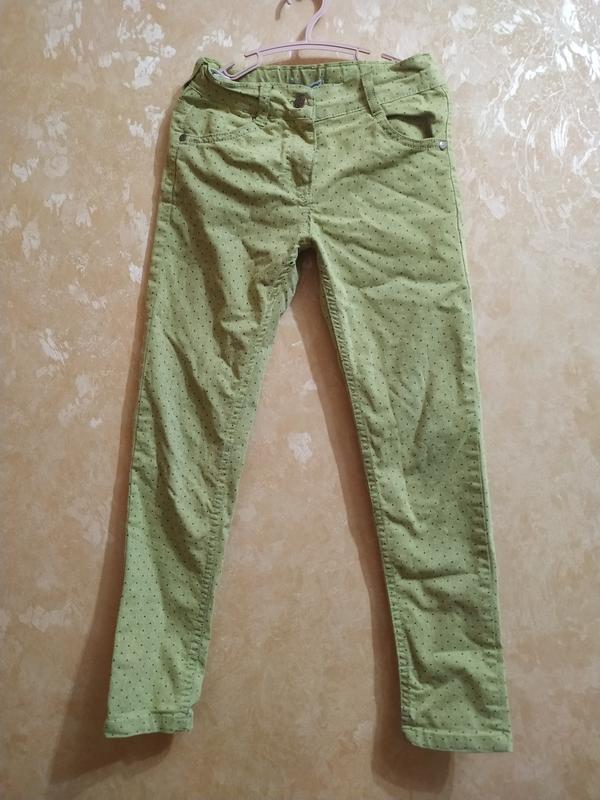 Яркие желто-салистые джинсы в черную точку. Пояс регулируется резинкой. Состав 80% - хлопок, 20% - полиэстер. На внутренней части бедра в районе попы была дырка (зацепилась за ветку, но она зашита, в носке не заметна В связи с условиями продажи на Шафе (15% от стоимости, но не менее 10 грн), вещи с маленькой стоимостью продаются при условии приобретения на общую сумму от 70 грн