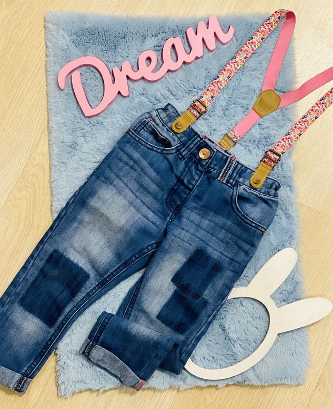 Красивые джинсы Next На подтяжках Состояние идеальное Длина 50 Шаг 34 Пот 25 ( сзади на резинке ) Подтяжки регулируются