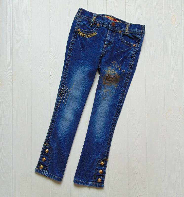 Стильные джинсы для девочки. Декорированы стразами. Материал тянется. Пояс на резинке, тянется. Шикарное качество. Apple bottoms. Размер 6 лет. Состояние: идеальное. Состав: 55% ramie, 27% хлопок, 17% полиэстер, 1% спандекс. Замеры: длина 71 см, шаговый шов 50 см, талия 30Х2 см, тянется до 38Х2 см, бёдра 35Х2 см, ширина штанины в районе промежности 18 см, ширина штанины внизу 15 см, глубина посадки 22-25 см. Цена 170 грн.