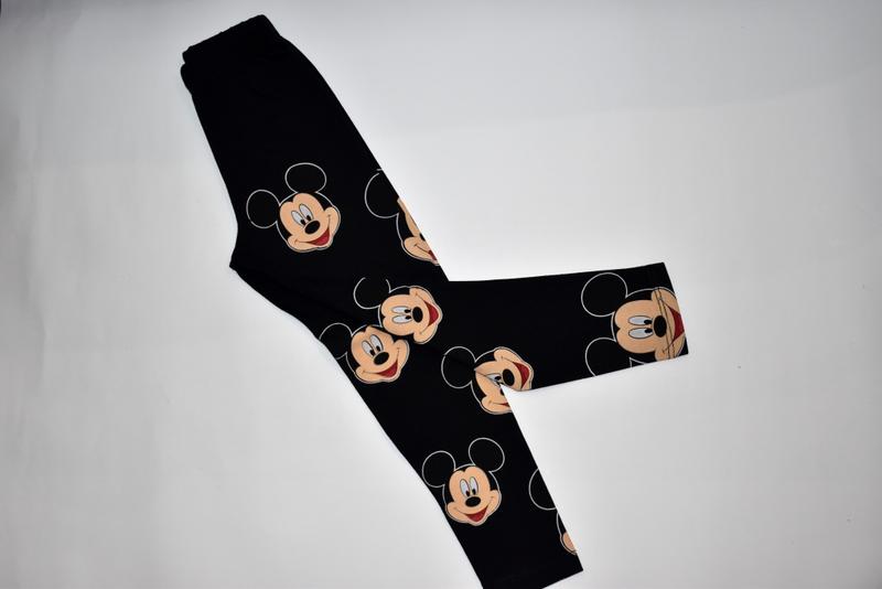 Лосини на вік 4-7 років. Виробництво - Туреччина. Колір чорний, принт Мікі. 4 р - довжина 56,5 см, пояс 19 см, шаг 39 см. 5 р - продано 6 р - продано 7 р - довжина 63,5 см, пояс 21 см, шаг 44,5 см. 8 р - продано.