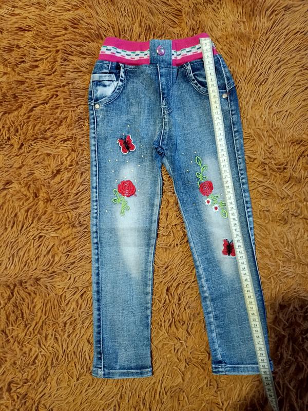 Джинсы демисезонные на девочку с красивой вышивкой и стразами на резиночке. Длинна 62 см, ПОТ 22 см и тянется до 31 см.