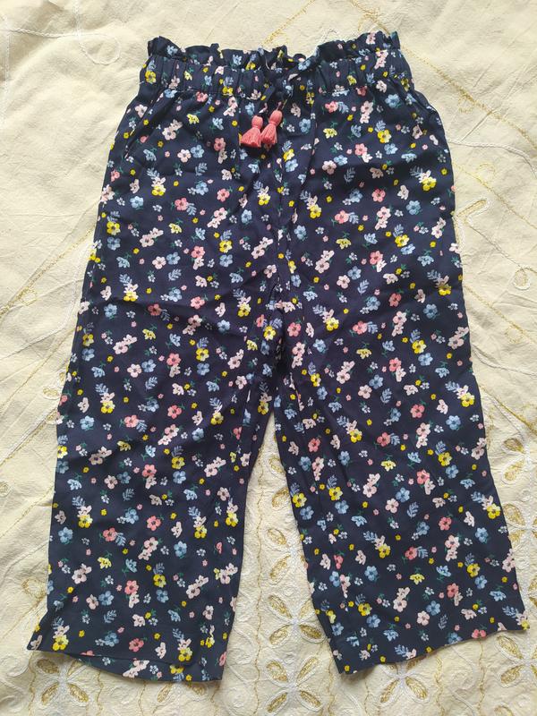 лёгкие брючки-разлетайки на лето на резинке. очень удобные - дочь носила прошлое лето подобные, я наперед купила несколько пар и на это лето - за зиму она переросла. цветочный принт, немаркие. размер 3-4 года либо рост до 104 см длина 51 см шаг 30 см пот в нерастянутом виде 22 см, в растянутом 32 см.