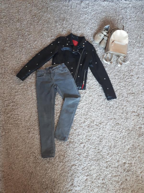 Класнючі джинси slim. На не дуже повнньку дівчинку. Класного графітового кольору. На ріст 132-137см.Поясочок регулюється з допомогою спеціальної резинки.