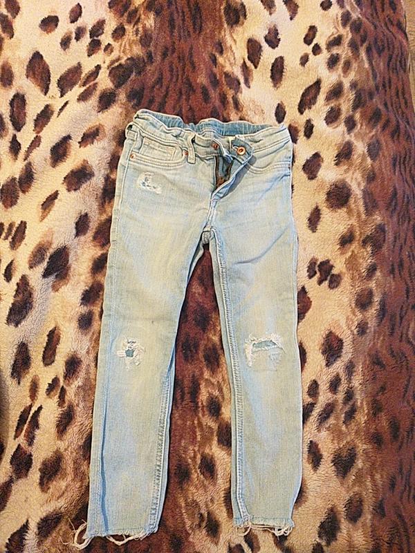 Стилтні дитячі джинси h&m б/в, в дуже доброму стані. Зроблені типу бойфрендів, з імітацією під прориви.Розмір 104. Заміри : ПОТ 26 (пояс регулюється) Довжина по внутр шву 41