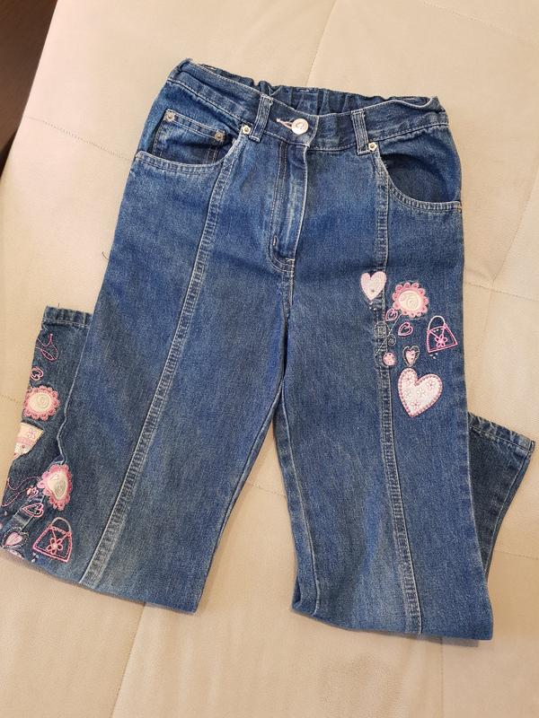 Джинси на дівчинку на зріст 128 см. Продаю, бо чищу шафу доньки. Висота штанини 76 см (по внутрішньому шву 53 см), ПОТ 27 см+ ще тягнуться до 30 см ( позаду є резиночка), є внутрішні резинові підтяжки на ґудзиках, посадка спереду 23 см. Склад 100% cotton.