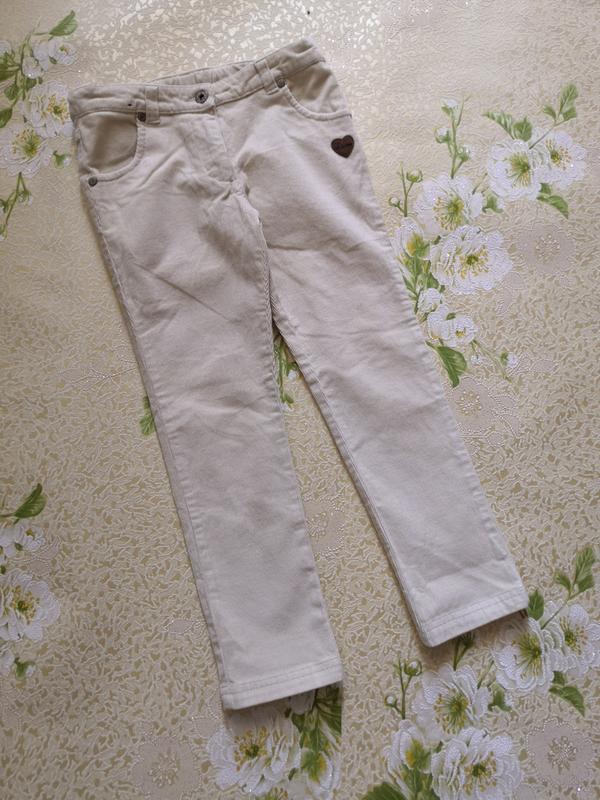 Брючки Original marines на 6 лет. Цвет айвори (между белым и жёлтым). Спереди и сзади по 2 кармана. В поясе есть утяжка. Длина по боковому шву 66 см, шаг 48 см, полуобхват талии 29 см, полуобхват бёдер 32 см. Ткань приятная к телу, качественная, в составе 98% хлопок, 2% элистан.