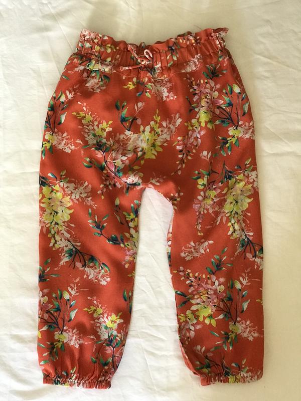 Легкі штанці на дівчинку, на зріст 98-104см. На літо -ідеальний варіант, дуже легкі, не парять, відмінно і на вихід і на майданчик. Тканина з бавовни з віскозою ( штапель) . Штанини внизу на резинці, пояс на резинці. Стан ідеальний.