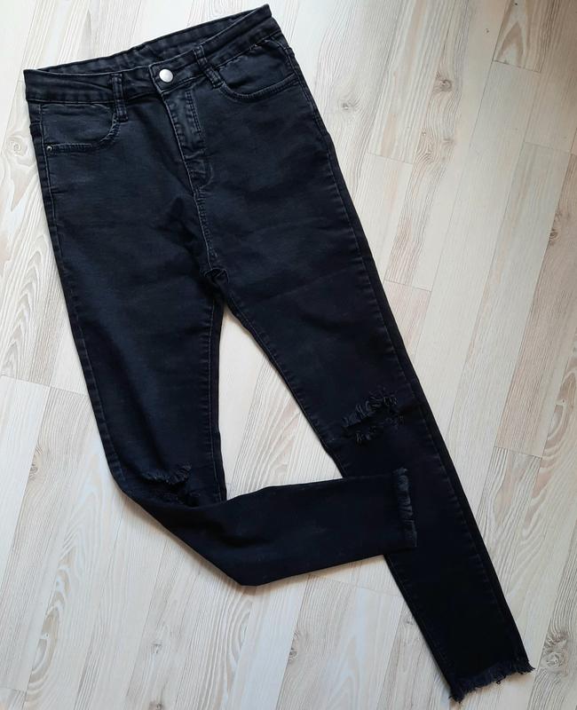 Джинсы стрейч с высокой посадкой. Цвет чёрный на коленях "дырки". Декорированные бахромой внизу штанины и сзади накладные карманы. Пояс без утяжки. В идеальном состоянии без дефектов. Размер:11лет-12лет/146см-152см Замеры: ПОТ-33см, ПОБ-40см, длина-90см, шаговый-66см, посадка 26см/32см