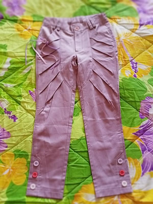 Продам стильные штаны- брючки на девочку размер 116. Состояние хорошее. Состояние новой вещи. Цвет не проявился полностью, в реальности цвет очень красивый нежный ( похож как фиолетово с сиреневым). Брючки смотрятся идеально. Брюки на молнии и пуговице. Имеются 2 кармашка. Состав: 100% Хлопок Замеры: длина 70 см, полу обхват по талии 27 см, полу обхват в районе бёдер 33 см, длина по середине от самого верха и до мотни по переду 18 см, по заду 20 см, ширина штанины 14 см, по низу отверстие штанины 12,5 см