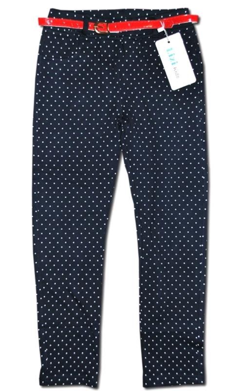 Расцветки 2 на выбор: синяя в мелкий горошек, а также синяя с принтом кошечки. Размеры: 104, 146, 152см. Материал: 95% хлопок, 5%эластан, с небольшим начёсом, мягкий, приятный и эластичный материал. В комплекте к штанам идёт тоненький лакированный поясок красного цвета Хорошо тянутся и имеют отличную посадку. Очень комфортные и удобные. При стирке не меняют формы и цвета. Идеально подойдут для школы.