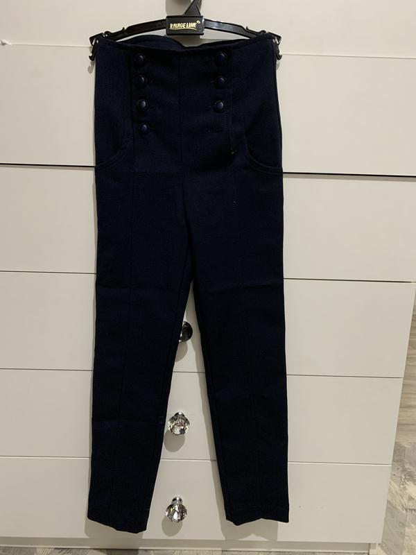 Брюки , темно синий цвет, высокая посадка, длина 83см по внешней стороне , ПО талия 30см (есть утяжка), ПО бёдра 33см, состояние идеальное .