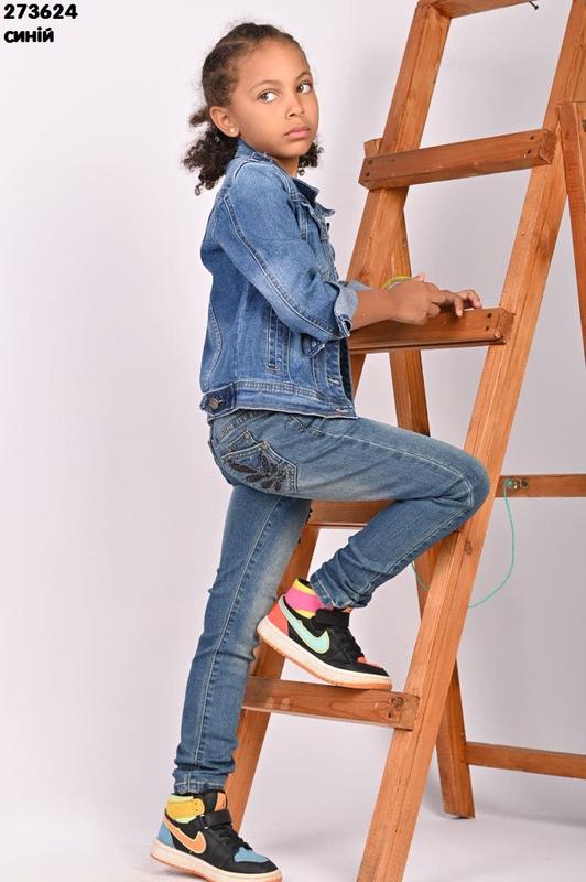 💋Модні дитячі джинси з вишивкою👖 ⚜️Країна виробник: Туреччина 🏷Матеріал: Cotton зі стрейчем. Тягнуться. В поясі утяжки немає. ✔Колір: синій з потертостями Прикрашені вишивкою зі стразами ✅Розміри: 122 128 134 140 146 152 На моделі р.134 (зріст 130 см)