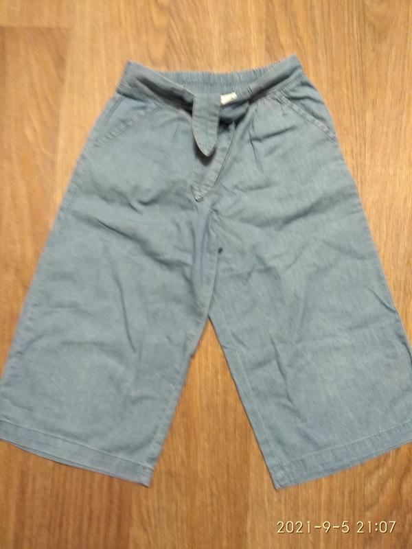 Фирменние штанишки кюлоти для девочки 5-6 лет, рост 116см Состояние идеальное Тонкий приятный джинс, кпасивого голубого цвета Пояс на резинке и спереди завязка Возврата нет Отправка после оплаты на карту продавца