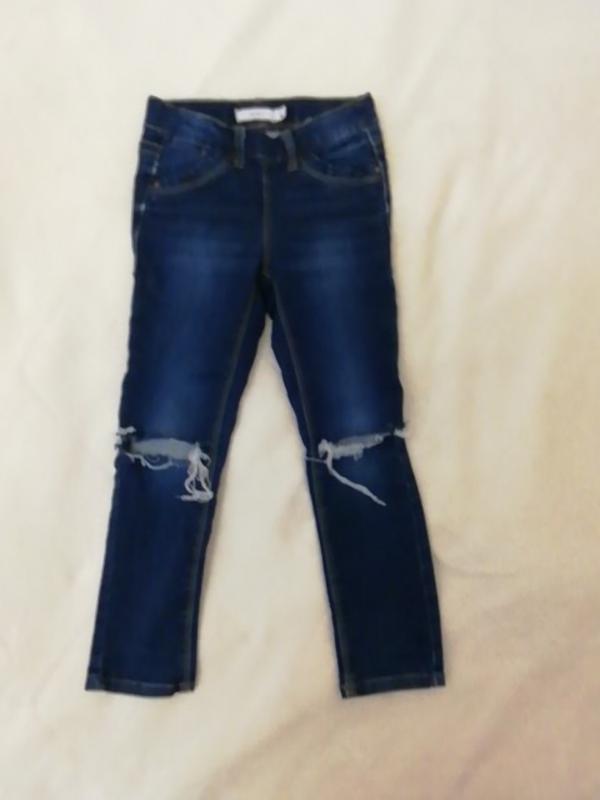 Джинси для дівчинки, з рваними колінами, самого красивого кольору, дуже зручні доданий не ножко еластан,пояс регулює я гумкою. 4-6. На ріст від 110 до 122. В ідеальному стані