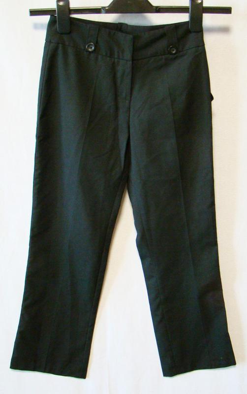 Из костюмной ткани с тефлоновым покрытием 65% полиэстр, 35% вискоза. С внутренней стороны пояса есть утягивающая резинка. Размер 134-140 (9 -10 лет). Ширина по поясу 32 см, по бёдрам 40 см. Длина по боковому шву 83 см, по внутреннему 63 см. Ширина штанины внизу 19 см. Глубина сиденья спереди 20,5 см, сзади 28 см.