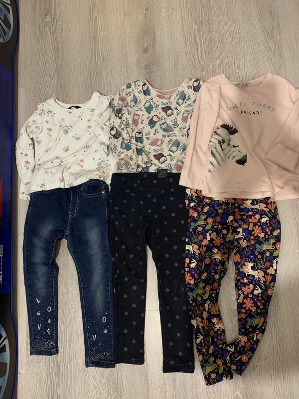 джинсы в идеале ,одеты 2-3 раза ,мягкие трикотажные штанишки (лосины) hm 4-5/110 года ,и лосины nect качество классное не тонкие ,кофточки 4-5 лет все в отличном состоянии