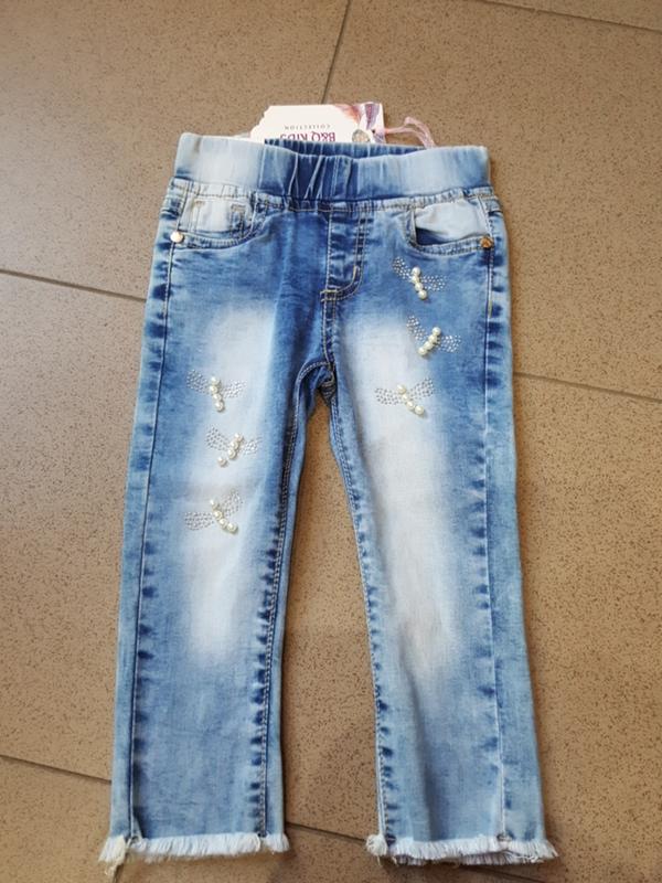 Джинси стрейчеві з перлинками у вигляді метелеків👍🏻 На1 рік Довжина по боковому шві 47см. Довжина по кроковому шві 30см Пояс на резинці.